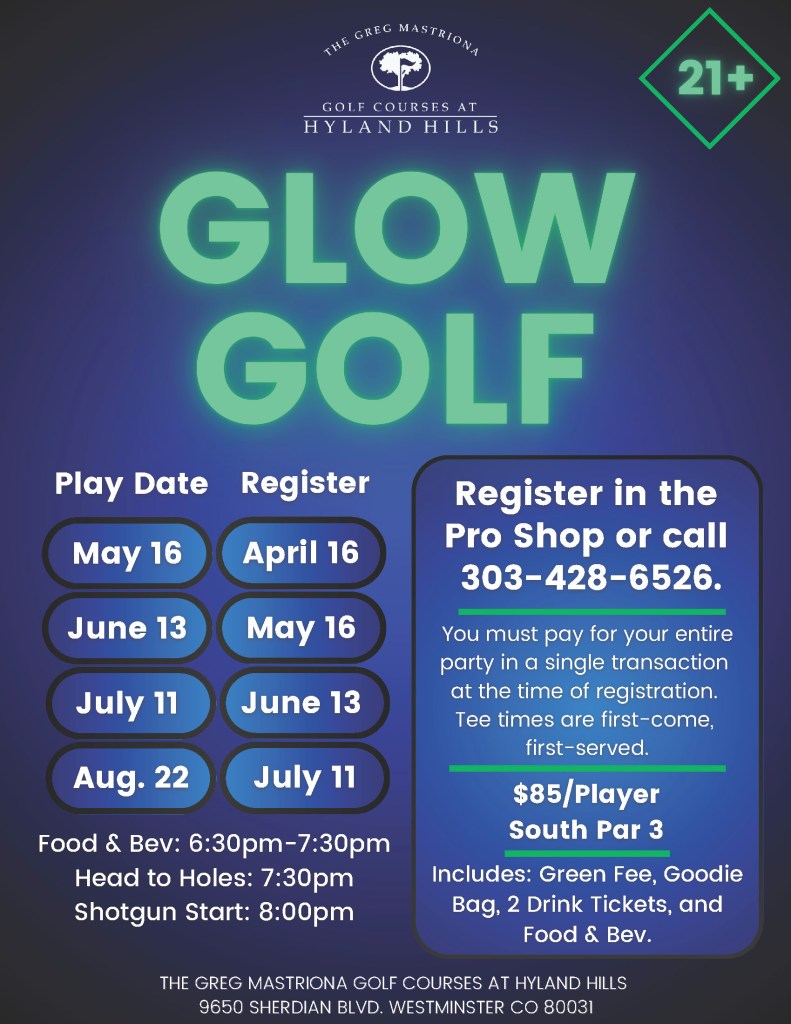 Glow Golf is offered once a month throughout the summer on the South Par 3 course and includes your green fee, goodie bag, two drink tickets, and food and beverage before the tournament! Drink tickets may be used at the restaurant or at the beverage cart.